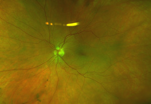 On examination, the patient’s best corrected visual acuity was 20/20 OD and 20/25 OS, with no improvement with pinhole. Extraocular muscles demonstrated a full range of motion and he was orthophoric at both distance and near. The patient’s fields were full in each eye as determined by the Humphreys Frequency Doubling Technique (FDT) perimeter. Pachymetry with the Oculus PARK1 measured 587 microns OD, 605 microns OS. The pupils were equal, round, and reactive to light with no relative afferent pupillary defect. Intraocular pressures were 11 mmHg OD and OS by iCare tonometry. Anterior segment findings were within normal limits, including posterior chamber intraocular implants in both eyes and no posterior capsular opacification OU.