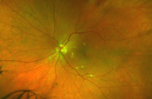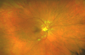 Upon funduscopic exam the following signs will be evident: small, yellow-white, slightly elevated lesions in superficial retina.6 They are normally <1/3 disc diameters in size, most commonly in posterior pole, with indistinct margins and overlying vessels.6 Performing an OCT scan over the white lesions is useful in identifying a swollen nerve fiber layer in the area of the cotton wool spot, which is diagnostic of the finding.6 Generally, patients are asymptomatic unless there is foveal involvement which can lead to a reduction in vision. Cotton wool spots may resolve in 6-12 weeks.7 Treatment is directed towards the underlying etiology. Prior to initiating treatment, a systemic work-up is indicated to determine the etiology of the retinopathy.