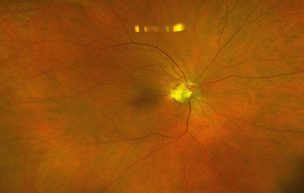 On posterior segment evaluation, the optic nerve head appeared well perfused, with normal cupping in both eyes; the maculas appeared flat and avascular. Several cotton wool spots were evident in the posterior pole, concentrated near the optic nerve head, greater in OD than OS, as seen in fundus photographs of the posterior pole (Fig. 1 & Fig. 2). There was no evidence of diabetic or hypertensive retinopathy. No other signs of pathology were found in posterior pole and periphery of either eye.
